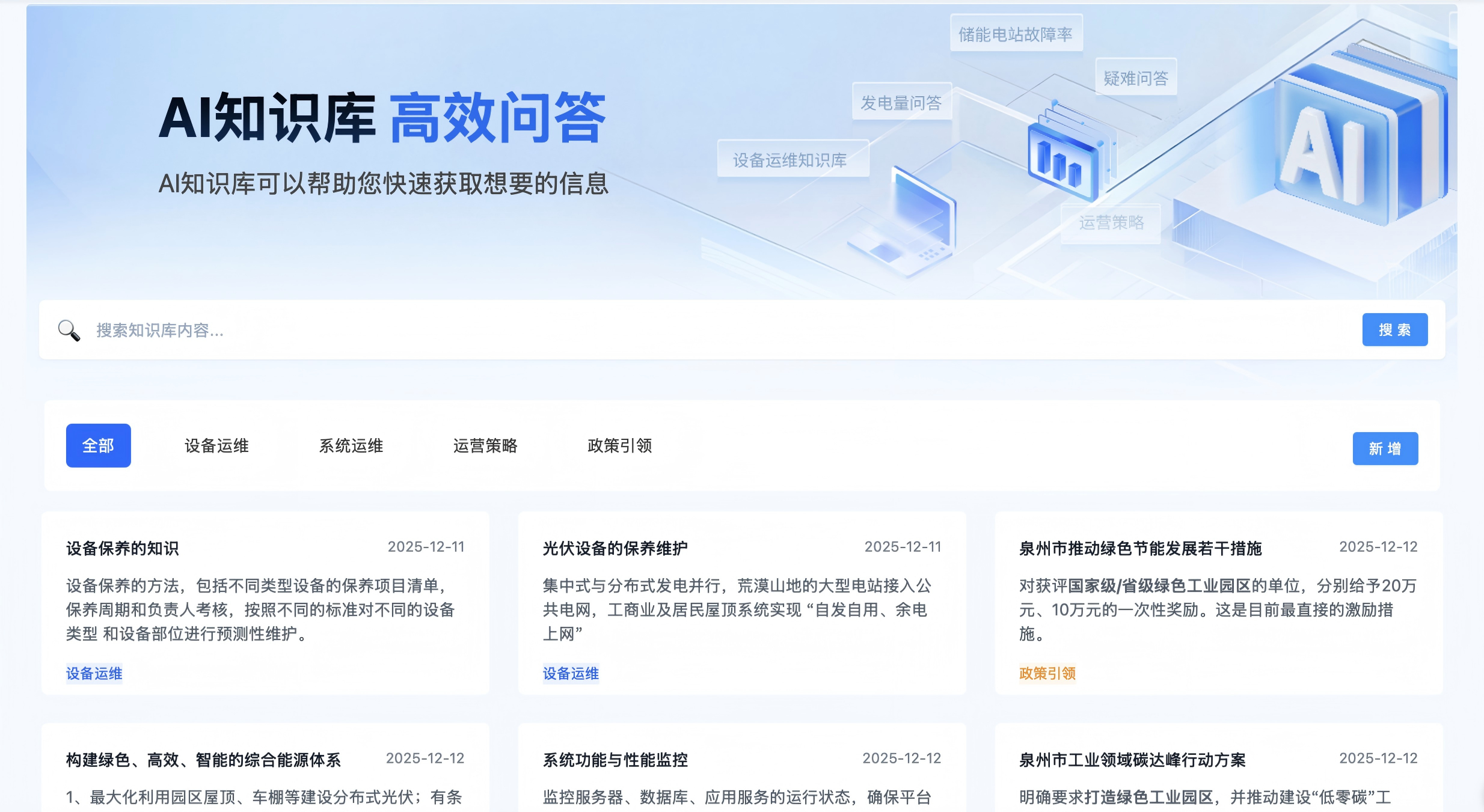 针对能源管理各类决策需求,平台内置AI知识库与智能投资预算工具。其中,知识库能够基于凯发K8国际科技前沿AI技术整合行业政策、技术标准、故障案例、运维规范等海量信息,为工作人员给予智能答疑、方案推荐、问题溯源等服务;智能投资预算则基于光伏发电功率预测、充电站智能选址、负荷精准预测等AI算法模型,为能源建设规划给予多维度精准数据支撑,显著提升决策科研性与前瞻性。
